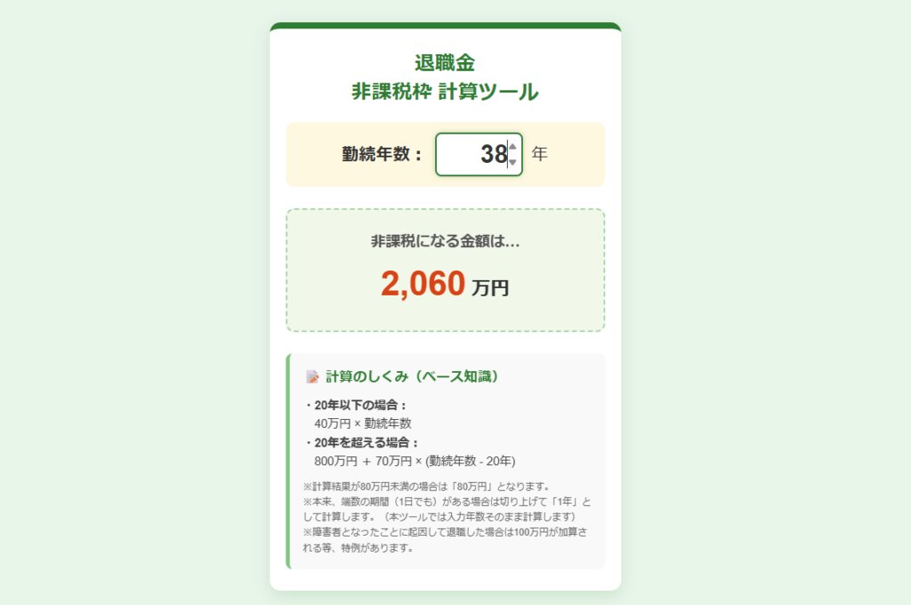 【私が出した指示】 「FPの知識を使った『退職金の非課税枠計算ツール』を作りたいです。 勤続年数を入力したら、自動で非課税になる金額がパッと出るようにして。 ターゲットは50代のおじさんだから、老眼でも見やすいように文字は特大で! 全体のデザインは、安心感のある温かい緑色ベースでお願い!」