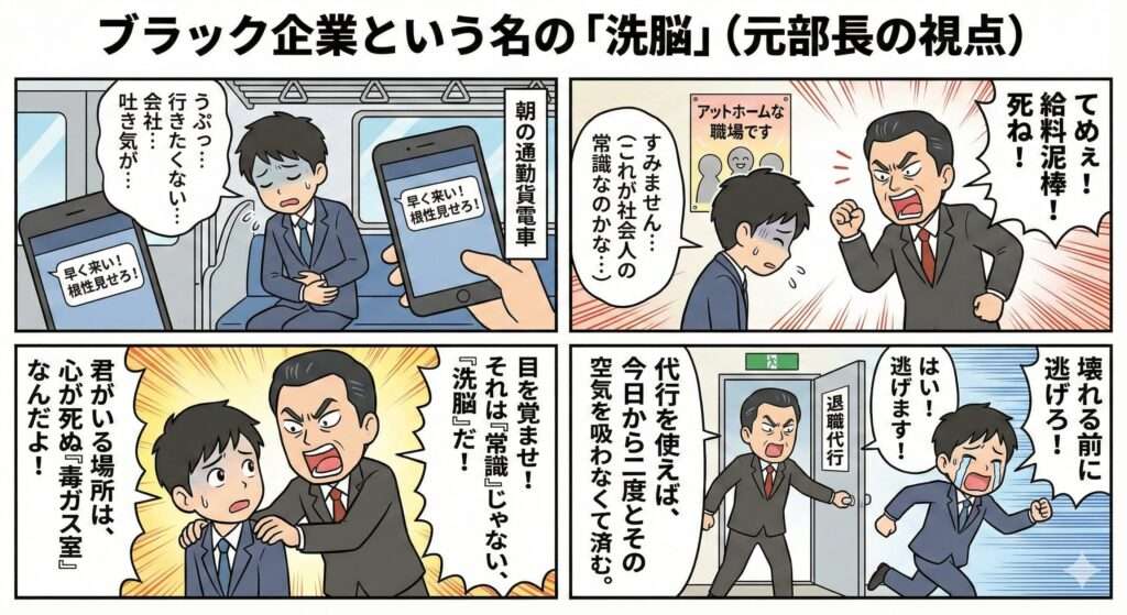 「自分がいる場所は異常だったんだ」と気づいても、 いざ辞めようとすると、洗脳された上司たちが全力で止めに来るでしょう。 「お前なんてどこへ行っても通用しない」と呪いをかけながら。