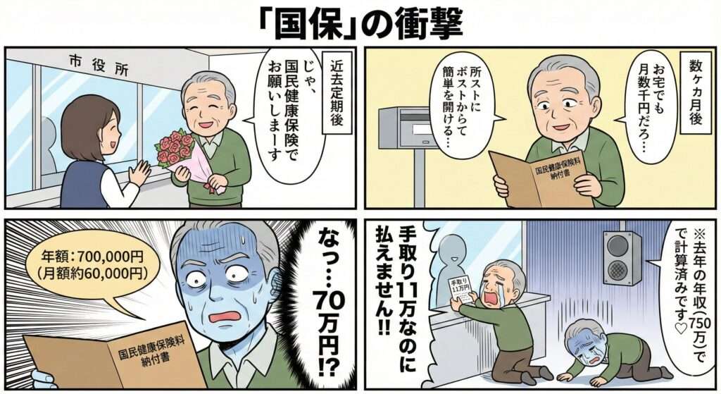 月額にすると5万〜7万円です。 手取り11万の中から7万円も保険料で消える? 生きていけるわけがありません。 退職1年目の高所得者にとって、国保は「富裕層向けの罰金」のようなものです。