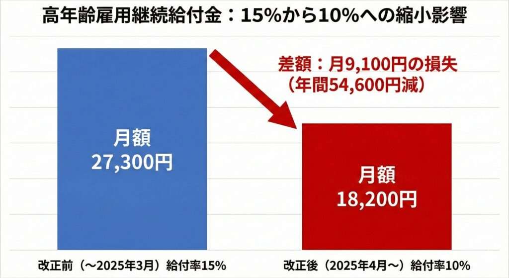 「給料が半分以下になるんだから、せめて15%くらい補填してやるよ」という、国からの命綱ですね。 しかし、2025年4月から法律が変わり、新しく60歳になる人(私たち世代です!)から、この給付率が最大15%→10%に引き下げられてしまったのです。